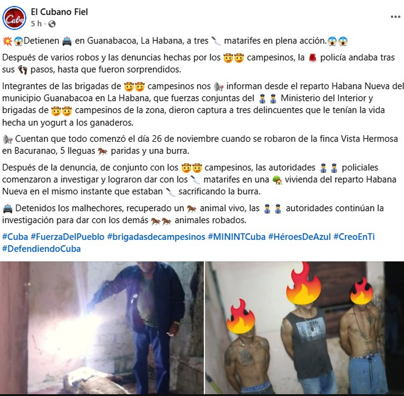 La información fue divulgada por la página oficialista El Cubano Fiel, que confirmó que los arrestos ocurrieron en el reparto Habana Nueva, después de varias denuncias hechas por campesinos afectados por el robo de ganado.