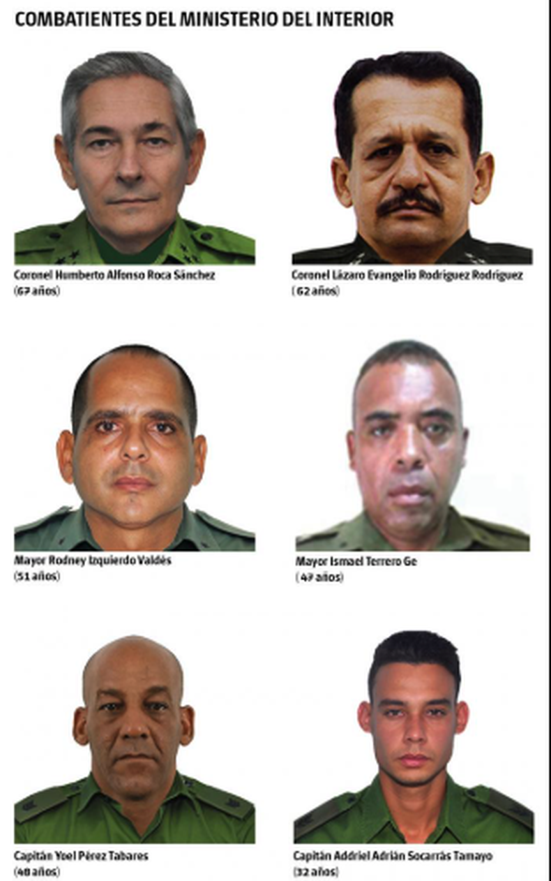 Según la nota institucional, los fallecidos murieron en combate directo o como consecuencia de bombardeos durante el operativo. El Ministerio del Interior los describió como “héroes que pusieron en alto el sentir solidario del pueblo cubano”.
